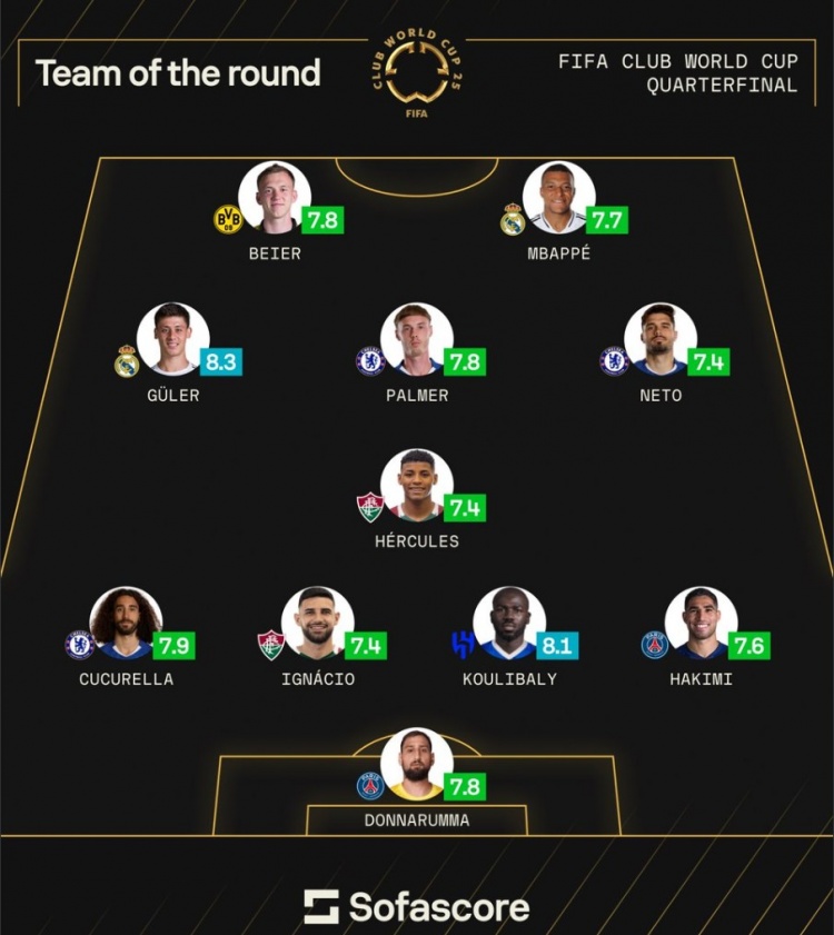 7月7日讯 世俱杯八强战已经落幕,sofascore也统计了世俱杯八强战评分最佳阵容。