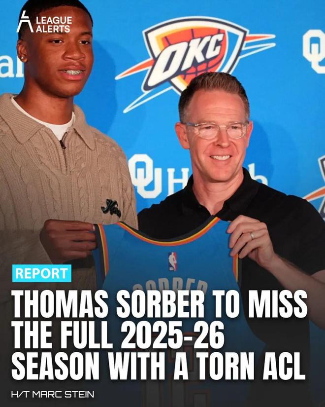 来自雷霆的一个不好消息。来自NBA记者Michael Scotto的报道,近日,雷霆新秀托马斯索伯在训练中遭遇了右膝前十字韧带撕裂(ACL撕裂),他将缺席下赛季的所有比赛。