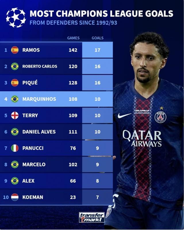 9293赛季以来欧冠后卫进球榜:拉莫斯第一、卡洛斯和皮克二三位