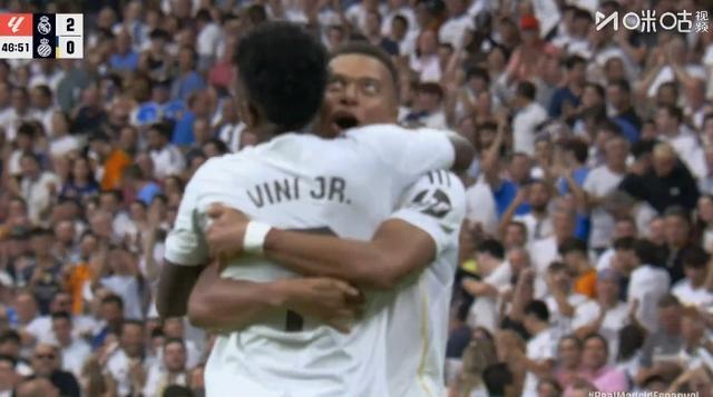 09月20日讯 皇马vs西班牙人比赛第46分钟,维尼修斯横传,姆巴佩禁区外原地摆腿远射破门,5场西甲打进5球,皇马2-0领先西班牙人。