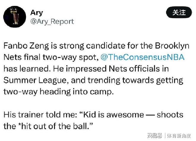 据此前多家美国媒体记者报道,曾凡博是篮网队最后一个双向合同的有力竞争者。