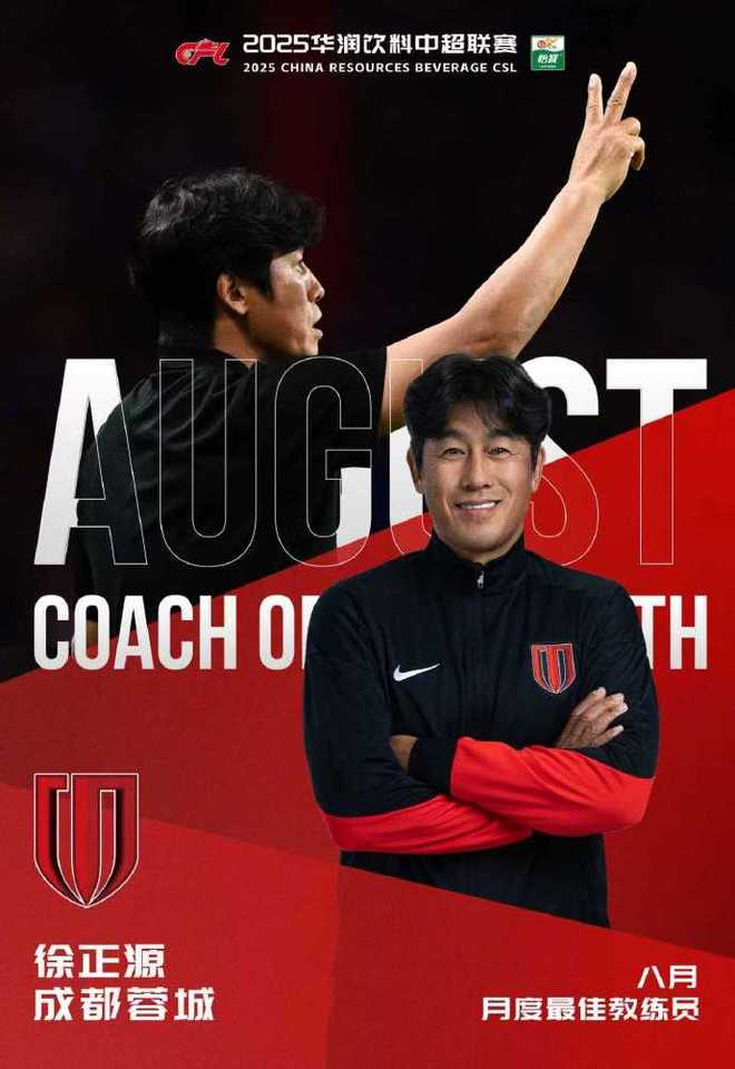 带队3胜1平保持不败的蓉城主帅徐正源,当选中超8月最佳教练。