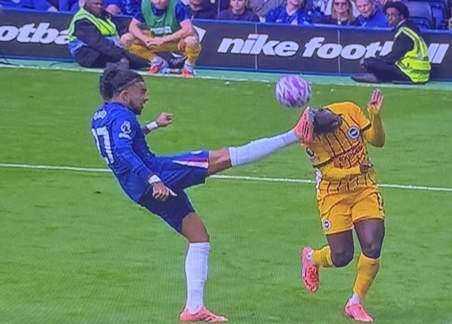 比赛第87分钟,古斯托禁区内踢到明特头部,裁判在看了VAR之后没有给予布莱顿点球。