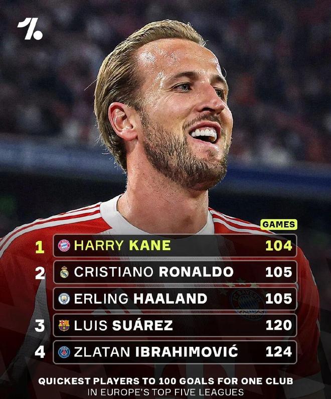 凯恩达成这一里程碑仅用了104场比赛,就此超越了哈兰德(曼城,105场)和C罗(皇马,105场)共同保持的纪录,成为21世纪欧洲五大联赛中为单一俱乐部攻入100球最快的球员。