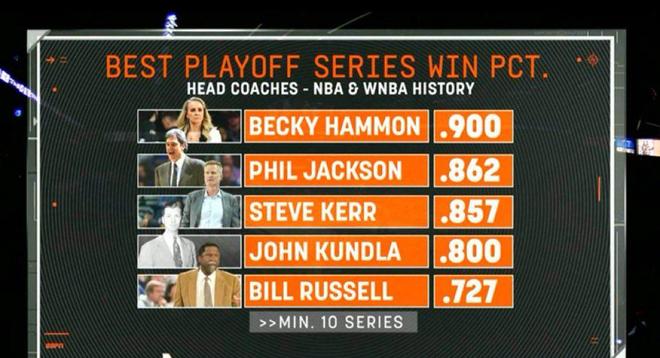 美媒晒WNBA与NBA季后赛胜率前五主教练:贝基哈蒙居首