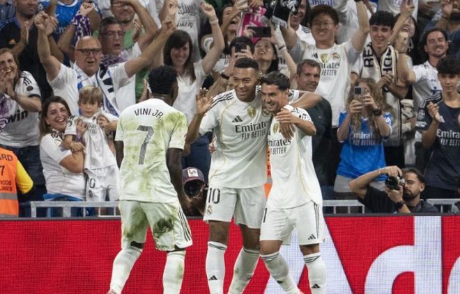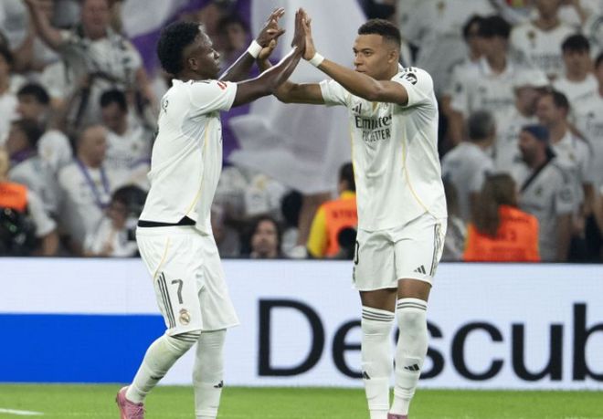 易边再战皇马继续加强进攻,开场仅1分钟,皇马右路压上大范围转移,姆巴佩禁区弧顶处策应头球摆渡顶到左侧,维尼修斯插上拿球,非常轻松的过掉穆里尼奥后杀入禁区,小角度大力抽射,皮球直入球门近端死角,皇马1:0打破僵局。第68分钟,维尼修斯又是左路强攻,这次他禁区边上突破马林的防守往禁区里冲,马林推了一下,维尼修斯应声倒地,主裁吹罚了点球。维尼修斯操刀主罚一蹴而就梅开二度,皇马2:0领先。