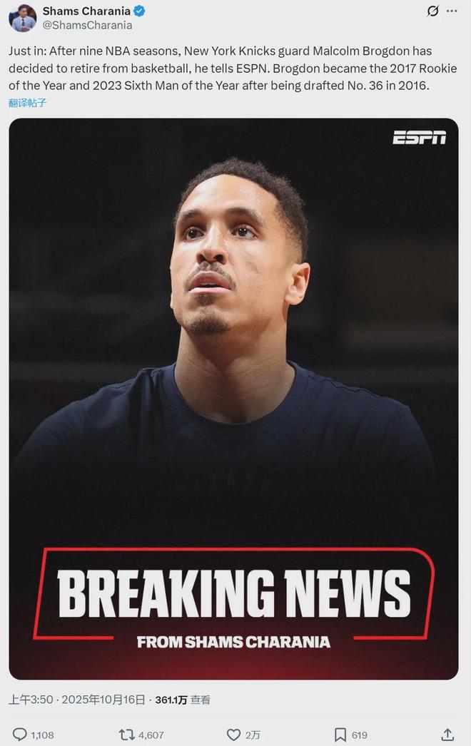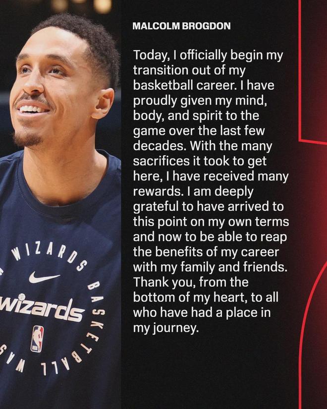 布罗格登发布退役声明:“今天,我正式开启职业生涯的转型之路。过去十多年,我自豪地为这项运动贡献了一切。能以自己的方式抵达终点,并能与亲友共享生涯的硕果,我深怀感激,也向所有在我旅程中留下印记之人致谢。”