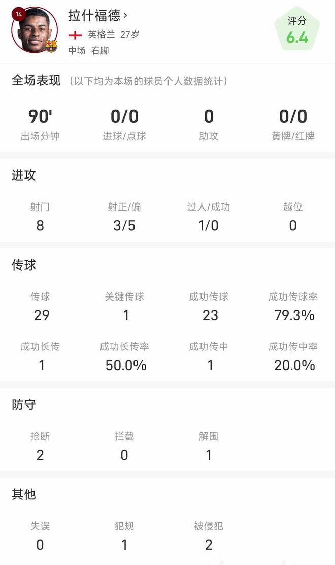 - 西甲 | 拉什福德数据:8次射门未能进球,29次传球23次准确