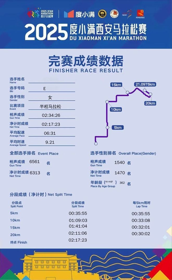 这次西马,于我而言远不止为夏训画上一个句号。跑步于我意义何在,我不清楚,却在夏训中倔强的坚持着。起早贪黑,腿疼没有放弃,高温也没有放弃,下雨也要坚持。我也曾经一次又一次地问自己:为什么没苦硬要吃?直到那一刻——当我奔跑在最熟悉的南大街,钟楼的秦腔吼破天际,声震长安。对家乡的爱与奔跑的快意轰然交汇,所有的汗与问,瞬间都有了答案。我知道,这一切都值了。