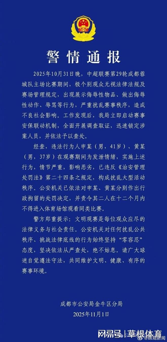 也可能是因为舆论的发酵,成都公安出手了,很快就发布了公告:经查,违法行为人申某(男,41岁)、黄某(男,37岁)在观赛期间为发泄情绪,实施上述行为,情节严重,影响恶劣,被行政拘留+禁止观赛。