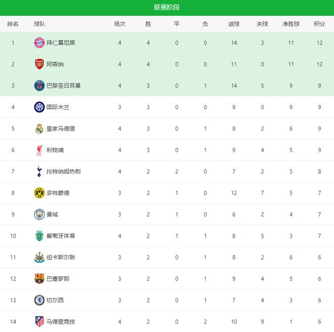 - 英超 | 利物浦10皇马+大巴黎12拜仁!欧冠最新积分榜:阿森纳4轮全胜