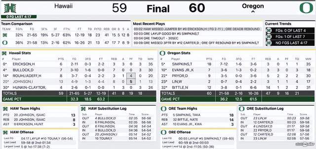 但是,林葳上半场没有运动战进球,4投0中,其中三分球2投0中,只是靠罚球拿到2分1篮板1助攻,另有3次失误。这样的表现,让我为林葳捏把汗。到了下半场,林葳依旧找不到手感,完全就无法融入这支球队的感觉,真是叫人感到汗颜。最终,俄勒冈大学60-59夏威夷大学,林葳首发出场17分钟,投篮7中0,三分4中0,罚球2中2,得到2分3篮板1助攻,并出现了4次失误和1次犯规。