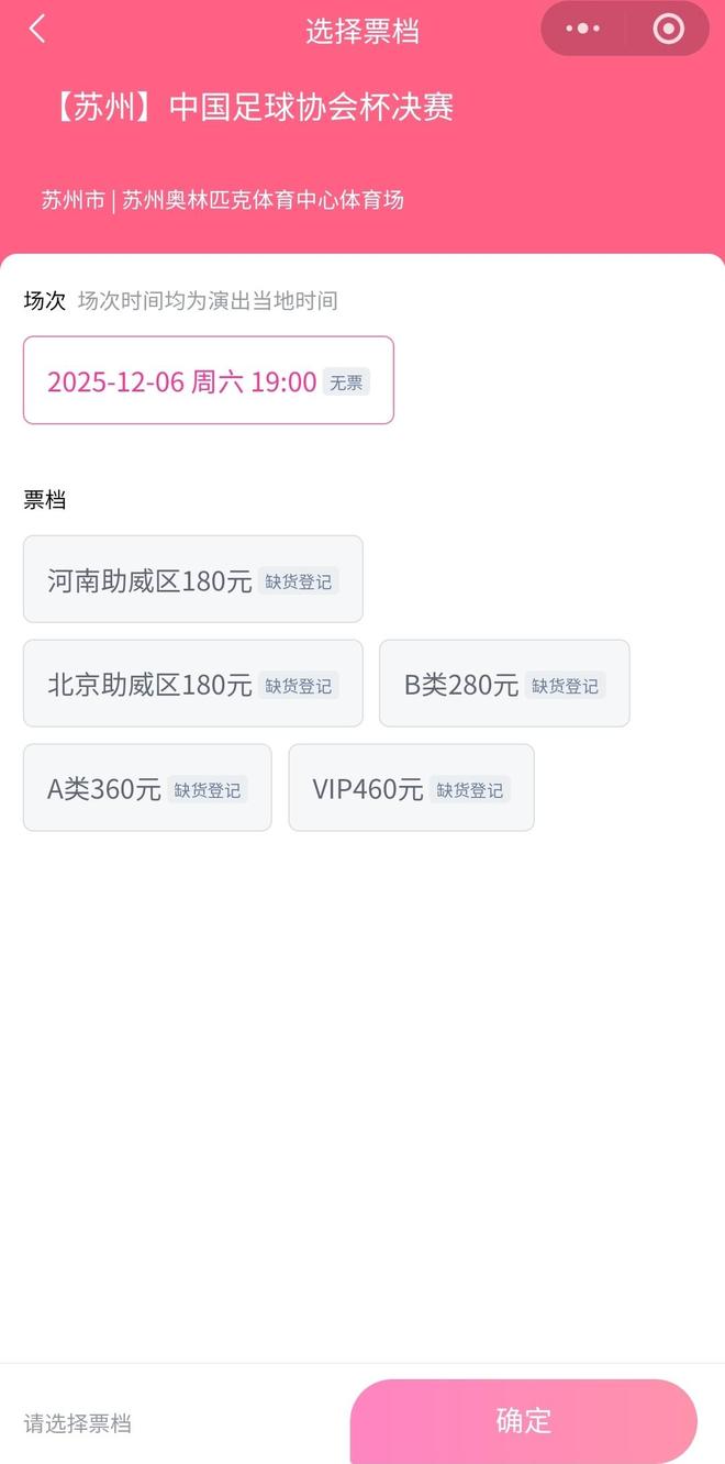 根据安排,6日10:58是足协杯决赛球票的开售时间。球票分为5个档次7个区域,包括:北京/河南专业球迷100元,北京/河南助威区180元,B类280元,A类360元,VIP460元。然而,11时5分许,相关平台就显示,所有档次和区域的球票“缺货登记”。