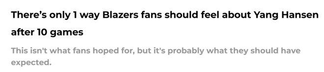 开拓者球迷对杨瀚森在队内角色的感受?失望、沮丧与困惑都可以理解,尤其是开拓者当初为交易选秀权而放走的球员——考沃德,如今已然在灰熊展现出未来球星潜质。但杨瀚森在赛季初期未能进入轮换阵容,还无需敲响警钟。他从一开始就被定位为“需要长期培养的璞玉”,而且开拓者目前已有尚可一战的中锋轮换配置:克林根、(近期加入的)杜普-里斯,以及罗伯特-威廉姆斯,完全没必要在这个阶段把杨瀚森推向“狼群”(意指让他仓促应对高强度比赛)。球迷们总爱支持新秀,尤其是像杨瀚森这样性格讨喜、风格独特的新秀。因此,休赛期的热度在赛季开打后迅速降温,难免让人有些泄气。但必须记住的是:绝大多数新秀在刚进入联盟时,表现都不尽如人意。