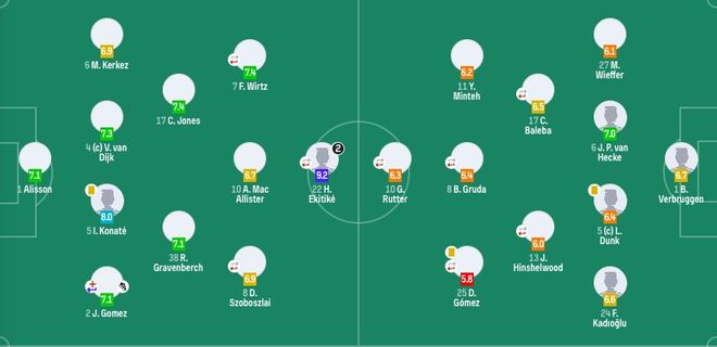 利物浦首发:1-阿利松、2-乔-戈麦斯(26'11-萨拉赫)、4-范戴克、5-科纳特、6-科尔克兹、8-索博斯洛伊(83'14-基耶萨)、10-麦卡利斯特、17-琼斯、38-赫拉芬贝赫、7-维尔茨(78'26-罗伯逊)、22-埃基蒂克(78'9-伊萨克)