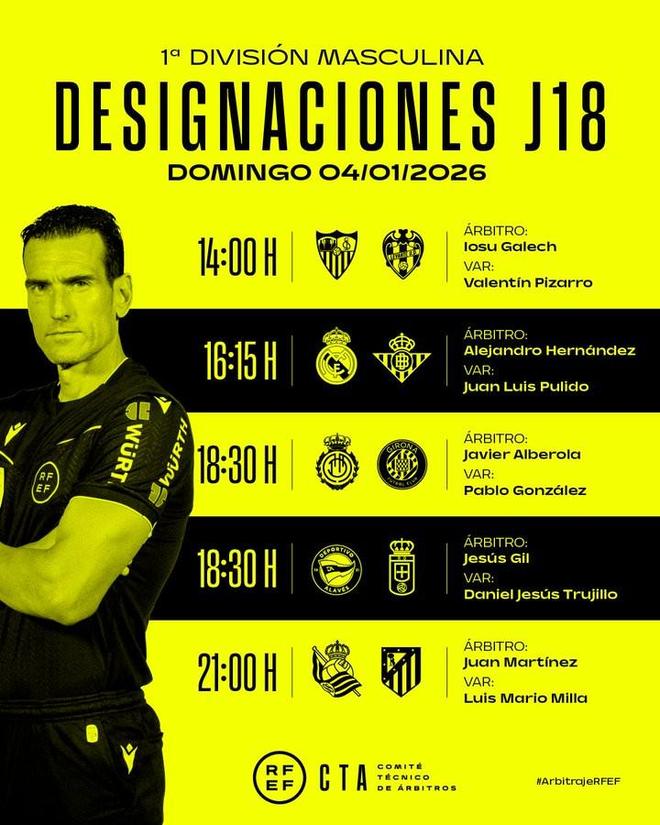 北京时间1月3日,西班牙足协官方公布了联赛第18轮第3比赛日的裁判名单,平方哥埃尔南德斯执法皇马vs贝蒂斯。